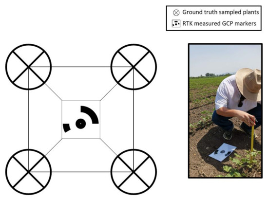 Canopy height measured by UAS is often derived from structure-from-motion (SfM) photogrammetry [13,49,50,51,52,53,54]. Techniques such as SfM allow low-cost visual band RGB cameras to obtain high-resolution three-dimensional (3D) first-surface-return point clouds and crop profile information and correlate this with yield and biomass [55,56]. A digital surface model (DSM) of the plant canopy is generated from the point cloud and a digital elevation model (DEM) of the bare soil surface can be generated from a secondary data source or soil points filtered from the point cloud [57]. However, photogrammetric algorithms are prone to both relative (distortions) and absolute (georeferencing) errors when only image data are used as inputs. To this end, the use of reference points, widely known as ground control points (GCPs) located in the field (either permanently or deployed prior to each measurement) is an essential practice to achieve higher spatial accuracy and obtain information about the performance of the implemented pipeline and metrics for generated photogrammetric products, while naturally minimizing 3D modeling errors [20,49,58].