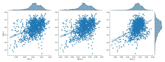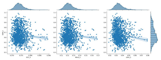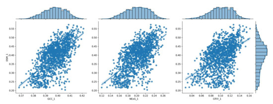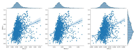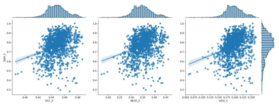 To visualize the results of the processing pipeline, the following plots show a series of histograms depicting the distribution of vegetation index values relative to the corresponding DSM values of each date (Figure 7, Figure 8, Figure 9, Figure 10 and Figure 11) at the spatial resolution of the reference grid (10 × 10 m2) along with the linear model that best fits each dataset. These plots illustrate the frequency and range of vegetation index values within a given range of DSM values, which can be used to compare vegetation parameters from one data collection date to the next and provide a better understanding of how vegetation parameters change over time.