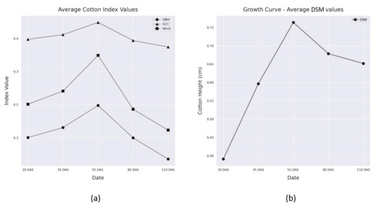 Information on canopy height is most useful when available at high spatial and temporal resolution. Despite the fact that there is literature that examines cotton growth parameters such as crown height, crown cover, crown volume, and Normalized Difference Vegetation Index (NDVI) using UAS [59], little research has been done on the multi-temporal estimation of plant height directly from 3D point clouds [60] or the possibilities of combined analysis of 3D and spectral information [20,61]. Although there is already a considerable amount of literature dealing with RGB-based estimation of crop height, there is no research comparing crop height with vegetation indices using UAS-based RGB imagery throughout the growing season.
