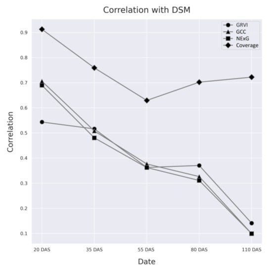 The Pearson correlation values between VI data and canopy coverage and the respective DSMs at the resolution of the reference grid (10 × 10 m2).