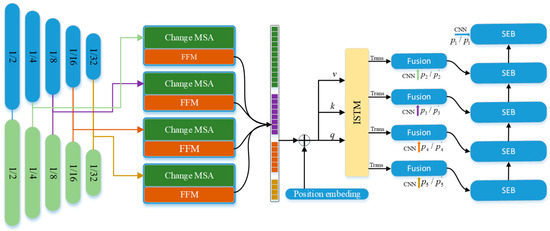 The structure of Change MSA is shown in Figure 4. The paired feature pairs are extracted using four groups of encoders. The features p and q in the channel dimension are interleaved to obtain .