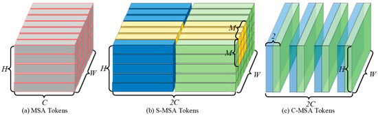 Two channels are combined into a group to build tokens: . Note that the subscripts at this time represent different token indices. Since C-MSA uses the paired spatial regions as a token, each token is reshaped from to , and its feature depth is . Compared with the token of the original MSA, as shown in Figure 3, the original MSA uses the spatial feature as the token, and there are HW tokens (Figure 3a). This paper uses the dual feature channel as the token, so there are tokens (Figure 3c).