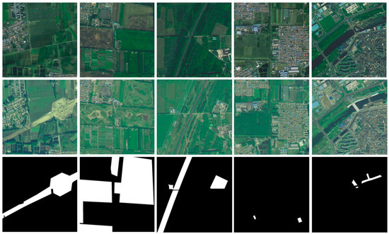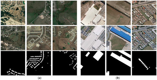 The LEVIR-CD dataset is selected for the high-resolution building change detection task with a spatial resolution of 0.5 m and contains 637 pairs of data with a size of 1024 × 1024, of which 445 pairs are used for training, 64 pairs are utilized for validation, and 128 pairs are employed for testing. Some data examples are shown in Figure 7a, where the building targets are small and relatively dense.