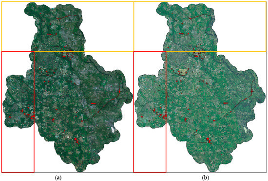 The TZ-CD dataset. The red area represents the change label. The yellow box area is used for testing. The red box area is used for validation. The other area is used for training. (a) Post-image. (b) Pre-image.