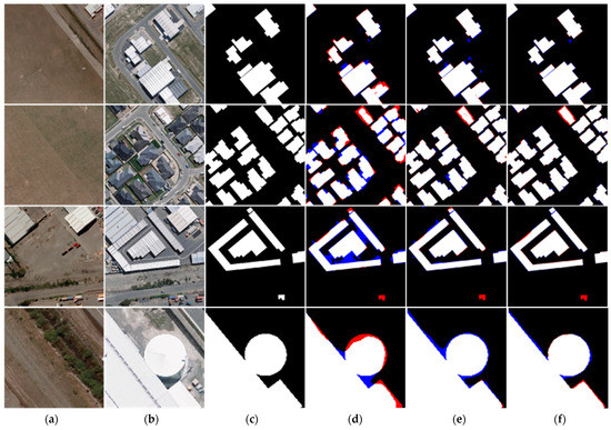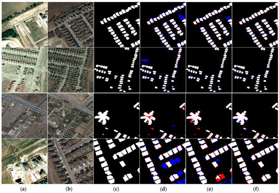 LEVIR-CD dataset results. The red area represents the missed area, and the blue area represents the wrong area. (a) Post-image. (b) Pre-image. (c) Ground truth. (d) Unet++_MSOF results. (e) DDCNN results. (f) TChange results.