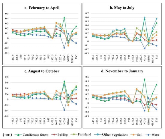 The spectral curves of six LULC types (coniferous forest, building, farmland, other vege-tation, soil and water); (a) spectral reflectance from February to April; (b) spectral reflectance from May to July; (c) spectral reflectance from August to October; (d) spectral reflectance from November to January.