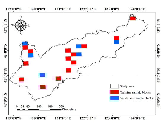 The spatial distribution of the sample blocks. In total, there are 20 blocks in the study area: six blue blocks were used for validation and 14 red blocks were used for training in deep models. The size of each block is 18 km × 18 km.