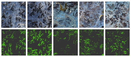 The distribution of coniferous forests is scattered in large areas with unclear boundaries. Manual interpretation is a cost-intensive, time-consuming and subjective process, and accuracy cannot be guaranteed. Liu et al. [] explored the ability of three different machine learning algorithms (i.e., DNN, SVM, RF) for Chinese pine extraction based on point samples, it is shown that the SVM classifier can achieve better results on Sentinel-2 multispectral imagery, with an extraction accuracy of as high as 91.1% after adding spectral indices (i.e., NDVI, NDWI, EVI, MSAVI). Therefore, we selected 20 subregions in the study area (Figure 3), 14 of them were used to train the deep learning models, and four of them were used as the verification data. The size of each subregion is 18 km × 18 km. We mapped coniferous forests in each of the 20 subregions using SVM on Sentinel-2 images, whose spatial resolution is much higher than Landsat, then the extracted results were post-processed, so as to eliminate salt and pepper noise and misclassification. The 20 coniferous forest maps were resampled from 10 m to 30 m, and the Landsat images of the corresponding area were obtained to form sample blocks with the resampled maps. In order to increase the number of sample blocks, the 20 sample blocks were cropped to 256 pixels × 256 pixels size using a random sliding window, and 640 sample blocks with smaller sizes were generated finally, with 512 training sample blocks and 128 validation sample blocks. Some of the sample blocks are shown in Figure 4.