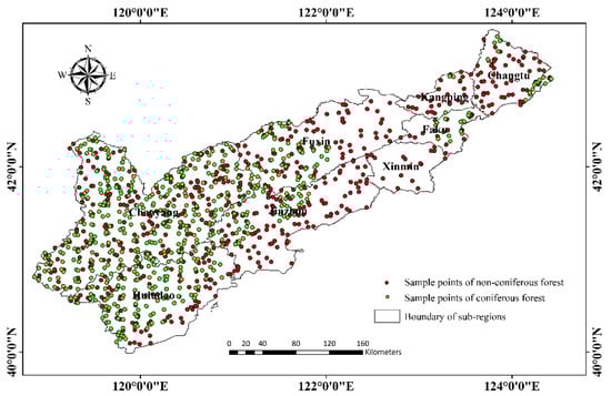 In recent years, extreme weather and climate events have occurred frequently around the world, posing a huge threat to the sustainable development of mankind. As a part of the terrestrial ecosystems, forests cover 31 percent of the global land area [], and they play an essential role in maintaining the balance of hydrological cycles, promoting the climate regulation and protecting the biodiversity [,,]. As an integral part of the forests, coniferous forests can grow well in harsh environments with a strong stress resistance, and they also have ecological, industrial and medicinal values [,,,]. Therefore, coniferous forests are widely used for afforestation, which can be of great significance for absorbing the greenhouse gases, soil and water conservation, wind prevention and sand fixation [,,]. The Northwestern Liaoning of China is adjacent to the Horqin Sandy Land in Inner Mongolia, China []. The harsh ecological environment (soil erosion, high accumulated temperature, low precipitation, etc.) seriously affects the lives of local residents. The coniferous forests distributed in Northwestern Liaoning include natural forests and artificial forests []. The artificial coniferous forests are formed by artificial afforestation and aerial seeding afforestation []. The plant density is uneven and the forest age structure is complex, including young forests, middle-aged forests, mature forests and over-mature forests []. Coniferous forests are often disturbed by natural factors (fires, pests and diseases, drought, etc.) and human factors (deforestation and reclamation, illegal occupation of forest land, etc.) []. It is critical to calculate the area of coniferous forests quickly and accurately for formulating the forest management strategies and government decision-making.