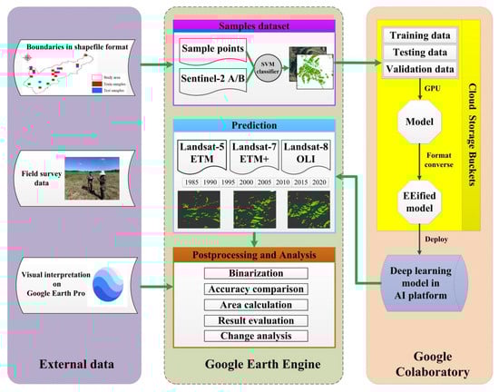 To realize the coniferous forest extraction at a large extent using deep learning methods in GEE, three products of Google, namely GEE, Google Cloud Platform (GCP) and Google Colaboratory (Colab) were used.