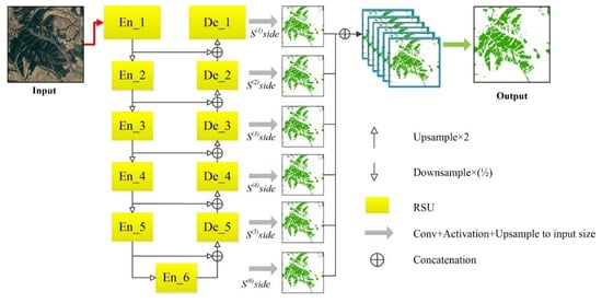 U2-Net is a two-level nested U-structure without using any pre-trained backbones from image classification [], and it was developed based on Unet. As shown in Figure 7, the U2-Net model consists of 11 blocks independent from each other, including six encoder blocks and five decoder blocks. In each block, a Unet-like structure called ReSidual U-block (RSU) is built. In the first four encoder stages (i.e., En_1, En_2, En_3 and En_4), the contextual information of different scales is obtained by using the convolution and down sampling operations, both of which are helpful for expanding the receptive fields. En_5 and En_6 are slightly different from En_1~4 in structure. As the feature maps’ resolution in the last two encoder stages (En_5, En_6) are relatively low, they are not suitable for further down sampling operations, which will result in the loss of useful contextual information. To solve this problem, dilated convolution is employed to replace the max-pooling operation. De_5, one of the decoder blocks, has the same structure as En_5 and En_6. De_1~4 have the same structure as En_1~4, respectively. In each decoder stage (i.e., De_1~5), the up sampled feature maps from its previous stage are concated with its symmetrical encoder stage, and the feature maps generated will be taken as the input of the next decoder stage. In the last part of the U2-Net, six saliency probability maps (i.e., S(1)side, S(2)side, S(3)side, S(4)side, S(5)side and S(6)side) are generated by using 3 × 3 convolution layer, sigmoid function and up sampling operations on the decoder stages De_1, De_2, De_3, De_4, De_5 and En_6. These saliency probability maps with a single channel have the same size as the input image, and they are then fused with a concatenation operation followed by a convolution layer and an activation function to generate the final coniferous forest probability map. Finally, pixels in the probability map with a probability higher than 0.5 were labeled as coniferous forests and the remaining pixels were labeled as non-coniferous forests in the map results [].