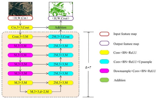Deep learning has been proven to be an excellent technique in numerous scientific fields []. CNNs are a branch of deep learning algorithms and are specifically used for image recognition and tasks that involve the processing of pixel data. Features are essential elements for deep learning, which can be obtained automatically by computer. Although they have been frequently used in CNNs, the convolutional filters with the size of 1 × 1 or 3 × 3 can only extract local contextual information. Under the circumstances, a light structure called residual U-blocks (RSU) was proposed in U2-Net, which can extract contextual information locally and globally. As is shown in Figure 8, the Unet-like structure of RSU-L(Cin, M, Cout) can obtain multi-scale contextual information through the encoder and decoder operations, where L is the number of layers in the encoder, Cin, Cout denotes input and output channels, and M denotes the number of channels in the internal layers of RSU. Firstly, a convolution layer is used to transform the input feature map (H × W × Cin) to an intermediate map (H × W × Cout) containing local features. Secondly, a Unet-like module with the height of L takes the feature map F1(x) as input, which is the core part of RSU. The large L is the richer local and global information that can be extracted from the feature maps. Operations, such as convolution, batch normalization, activation, max-pooling, bilinear interpolation and concatenation integrated into the encoder-decoder structure are used to obtain multi-scale features. Finally, the local features and the multiscale features are fused by a residual connection.
