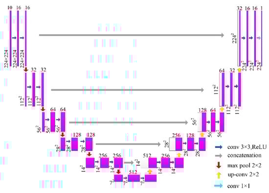 The original U-Net [] was first proposed by Ronneberger in 2015 with five stages from 572 × 572 pixels up to 28 × 28 pixels. The input image has only one single channel. In our adapted variants of U-Net, the stages are increased from five to six compared with the original architecture. The input image measures 224 × 224 × 10 pixels. As is shown in Figure 9, each of the six stages has two convolutional layers composed of operations, such as convolution, batch normalization and relu. The size of the feature map in each encoder stage is halved (i.e., 224, 112, 56, 28, 14, 7) and the channel number becomes twice as much as the previous stage (i.e., 16, 32, 64, 128, 256, 512). These are achieved by using max-pooling and convolution. The size of the last encoder stage is 7 × 7 pixels. The other indispensable branch, namely decoder stages, has similar structures to encoder stages. The first feature maps in the decoder stages are generated by concating up sampled feature maps from its previous stage and those from its symmetrical encoder stage. To restore the size equal to the input image, the last feature maps of each decoder stage are up sampled to a given size to its double, stage by stage from 7 × 7 to 224 × 224.