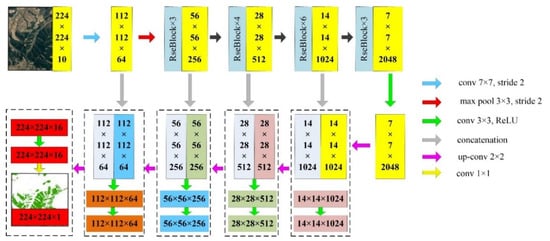 He et al. [] introduced a deep residual learning framework called residual blocks in the year 2016. Resnet50 is one of the typical resnets, which has as many as 50 layers, including a convolution layer (size of 1 × 1 and 3 × 3), batch normalization, activation, max-pooling and shortcut connection. Resnet50 can learn more features from input images than models with shallow depth. In order to combine the advantages of resnet50 and Unet, a variant of Unet named Resnet50-Unet was proposed [,], in which the encoder stages of Unet were replaced with a resnet50, and the decoder of the Unet architecture remained the same. The input image measures 224 × 224 × 10 pixels and the code size is 7 × 7 pixels. Six stages are constructed in the model. The component diagram of the adapted U-Net architecture is shown in Figure 10.