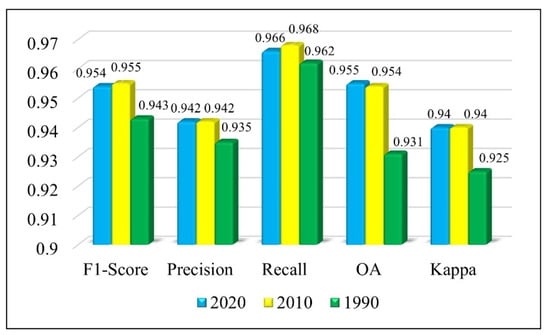 The sample points of the coniferous forests in 1990, 2010 and 2020 (Table 3) were collected and the same metrics as in Section 4.1 were used to evaluate the temporal transferability of the U2-Net quantitatively (Figure 13). F1 score, precision, recall, OA and kappa of the coniferous forests in 2020 were 95.4%, 94.2%, 96.6%, 95.5% and 94.0%, respectively. The values of these five metrics in 2010 were very similar to those in 2020, with an F1 score of 95.5%, precision of 94.2%, recall of 96.8%, OA of 95.4% and kappa of 94.0%, respectively. Compared with 2020, the coniferous forest extraction accuracy in 1990 had decreased significantly. Among the five metrics, the F1 score was 94.3%, precision was 93.5%, recall was 96.2%, OA was 93.1% and kappa was 0.925, decreased by 0.1%, 0.7%, 0.4%, 2.4%, and 1.5%, respectively. During the 30 years from 1990 to 2020, the changes of climate, ground humidity, atmospheric conditions and other factors influenced the reflectance of coniferous forests, which were the main reason for the decline in extraction accuracy. Through analysis, it can be found that although there is a long time interval (30 years), the highest decline rate is only 2.4% among the five evaluation metrics of three years (1990, 2010, 2020), and all of these accuracy metric values are above 92.5%, which is a satisfactory result. Therefore, it can be judged that the U2-Net deep learning model has good temporal transferability characteristics.