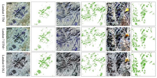 First of all, we directly apply the U2-Net model fully trained by sample blocks generated from satellite images in the year 2020. Figure 13 shows the extraction results of coniferous forests in 1990, 2010 and 2020. Three typical areas located in the northeast, southwest and northwest of the study area were selected to display the extraction results. The land cover types in these areas including grassland, farmland, water, coniferous forest, broadleaf forest and bare land. The coniferous forests in the remote sensing images of different years and sensors can be extracted finely, which can be seen in Figure 14.