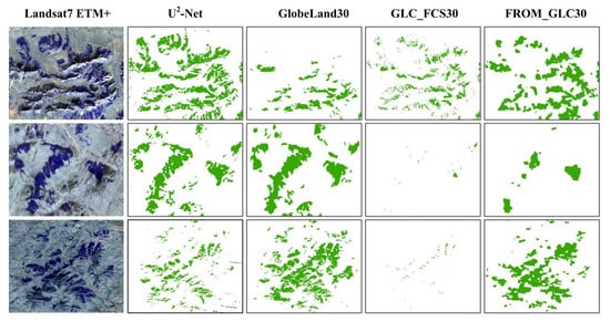 Three representative coniferous forest distribution areas in Northwest Liaoning were selected and the corresponding results come from the four datasets mentioned above are shown in Figure 15. The first column shows the Landsat-7 ETM+ images, and columns 2 to column 5 are coniferous forest maps corresponding to the first column. Through visual interpretation, U2-Net could map the distribution of coniferous forests more completely compared to GlobeLand30, FROM-GLC and GLC_FCS30, which ranked from second to fourth in terms of their performance in coniferous forests extraction, respectively.