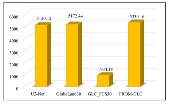 Additionally, we calculated the coniferous forest area in Northwest Liaoning in 2010. As shown in Figure 16, the area of U2-Net is 5120.12 km2, which is very close to the 5172.44 km2 of GlobeLand30. The area of FROM-GLC is 5339.16 km2, which is 219.04 km2 greater than U2-Net, and 166.72 km2 greater than GlobeLand30. However, the area of GLC_FCS30 is 934.18 km2, which is quite different from U2-Net, GlobeLand30 and FROM-GLC. This conclusion is consistent with that one based on a visual interpretation. Many factors can affect the extraction accuracy of coniferous forests. Although the remote sensing data sources used in the four datasets were exactly the same (Landsat-7 ETM+), the distribution of training samples, seasonal factors and algorithms can all cause differences in the extraction results of coniferous forests. GlobeLand30, FROM-GLC and GLC_FCS30 are global LULC products. To achieve better classification results, the remote sensing images selected were all from the green season. However, this period was not conducive to the extraction of coniferous forests, and it is easy to confuse coniferous forests with other tree species (poplar, willow, elm, etc.). It had been proved through experiments in Section 2.2 that the best seasons for extracting coniferous forests are winter and spring. The sample points with a higher density used in this study were obtained through field surveys and visual interpretation, which has a higher accuracy than those used in existing LULC data products. In terms of algorithms, GlobeLand30, FROM-GLC and GLC_FCS30 all used traditional machine learning methods, however, the deep learning methods have certain advantages in feature extraction and classification. In summary, the coniferous forests extraction method based on U2-Net in this paper is feasible.