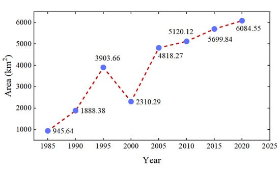 We calculated the coniferous forest area in the study area in the years 1985, 1990, 1995, 2000, 2005, 2010, 2015 and 2020, respectively. The results are shown in Figure 18. The area of coniferous forests in Northwestern Liaoning showed an upward trend in the past 35 years. In 1985, the area of coniferous forests was 945.64 km2, accounting for only 1.50% of the total area of the study area. By 2020, the area of coniferous forests had become 6084.55 km2, accounting for 9.68% of the study area. The net increase of coniferous forest area was 5138.78 km2 from 1985 to 2020, and the increased coniferous forest area accounted for 8.17% of the study area. During the 35 years, the coniferous forest area in the study area increased by 543.43%. In the two periods of 1985–1990 and 1990–1995, the number of coniferous forests increased rapidly. From 1985 to 1990, the area of coniferous forests increased by 942.40 km2. From 1990 to 1995, the forest area increased by 2015.28 km2, and by 1995, the total coniferous forest area was 3903.66 km2, accounting for 6.21% of the study area. However, the year 2000 was a special time, and it was the only year in which the area of coniferous forests decreased over the 35 years. According to statistics, the area of coniferous forests in 2000 was 2310.29 km2, and decrease of 1593.37 km2 compared to 1995, the reduced coniferous forest area accounted for up to 2.53% of the administrative area.