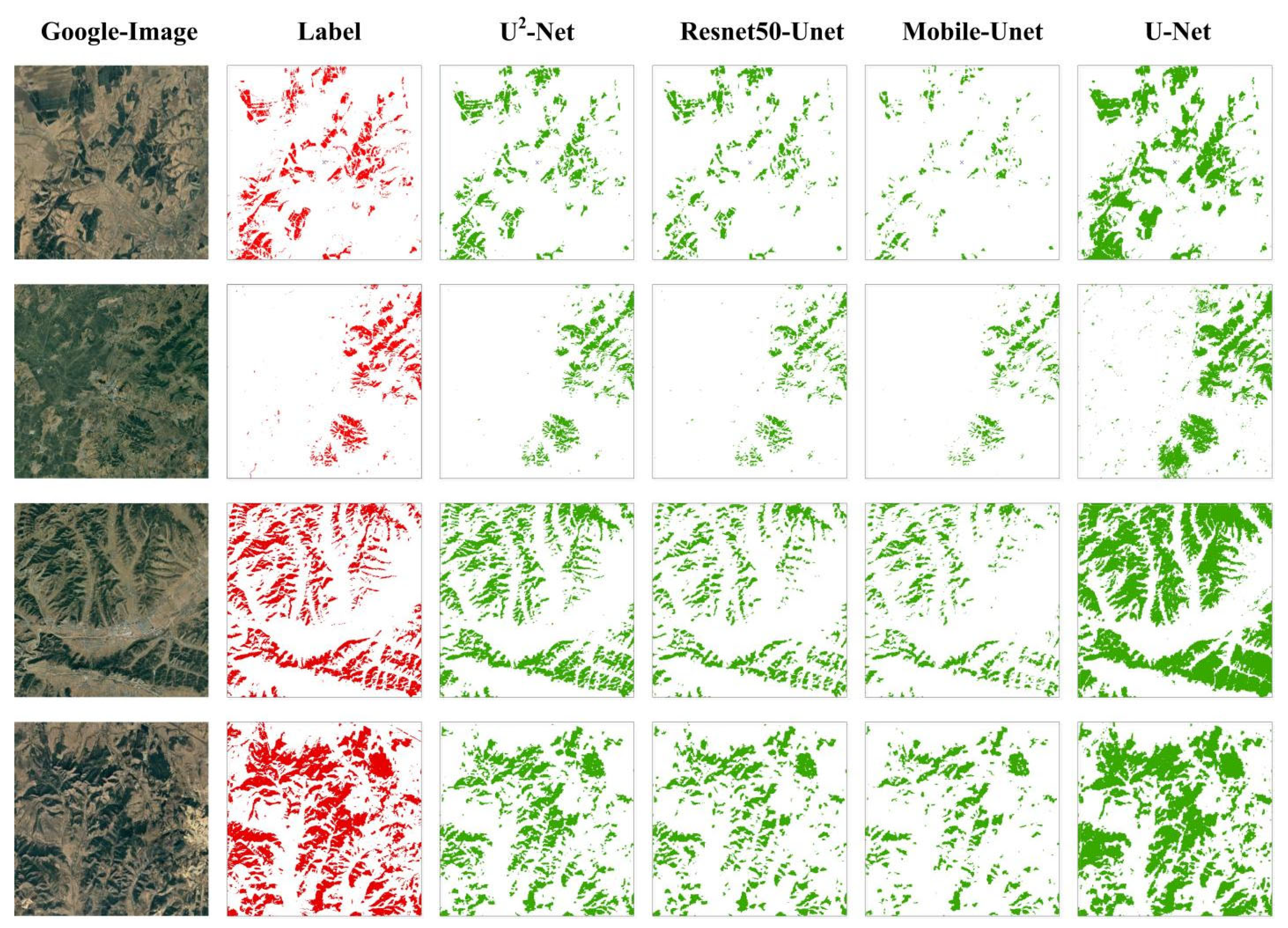 Deep learning methods, such as U2-Net, Resnet50-Unet, Mobile-Unet and U-Net are employed in this paper to map the distribution of coniferous forests. To measure their performance objectively and quantitatively, five commonly used accuracy evaluation metrics, including overall accuracy (OA), recall, precision, kappa and F1 score are calculated based on the obtained data from the field survey and visual interpretation, which have been mentioned in detail in Section 2.4.