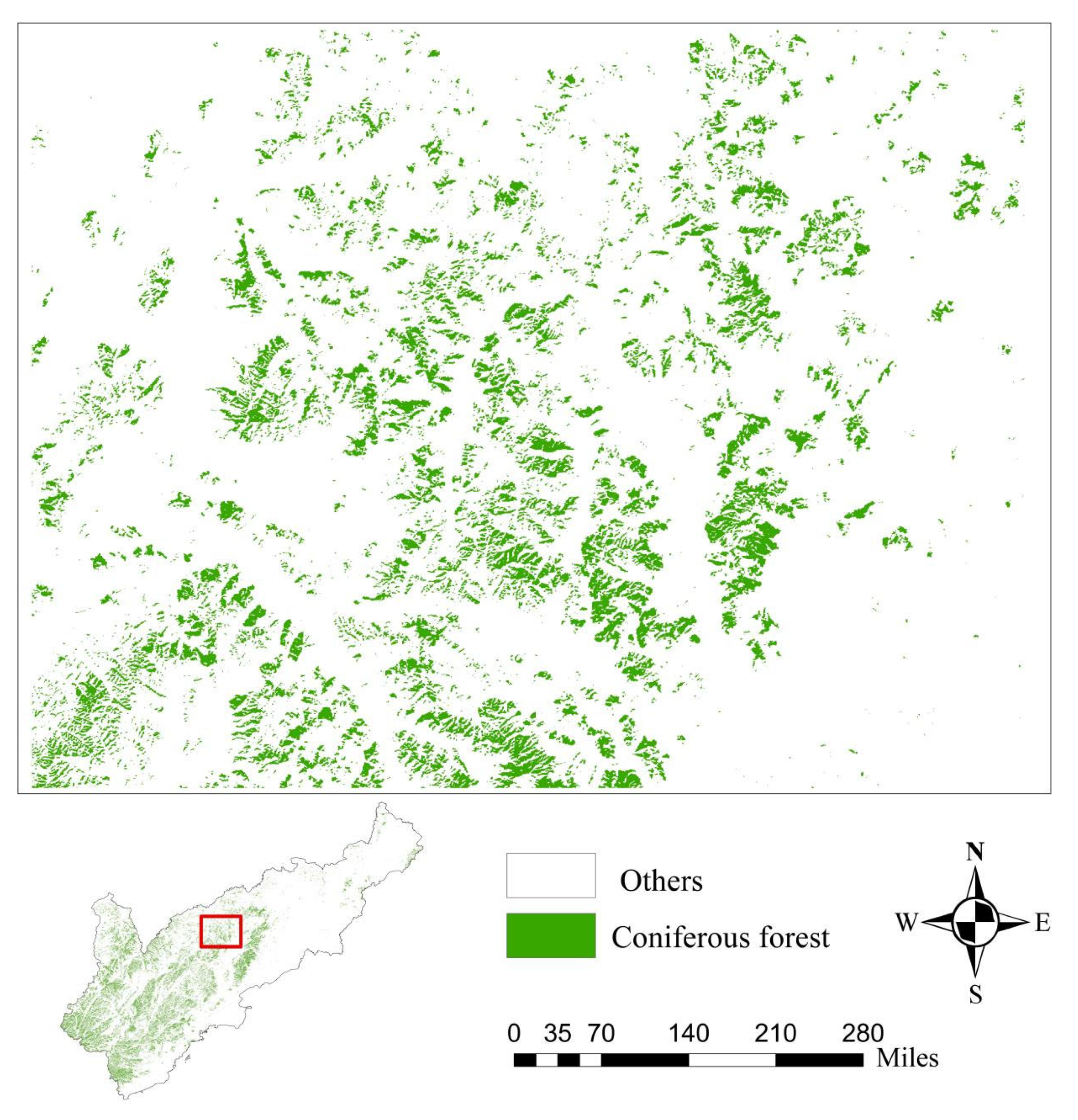 Remote sensing technology has been widely used to measure forest structural and compositional attributes (tree species, tree height, diameter at breast height, crown width, etc.) due to its wide observation range, high temporal resolution and fewer restrictions on the ground environment. Until now, the images from satellites, such as Landsat, Sentinel-1/2 and Gaofen-1 have been publicly available, and they have been widely used in the field of tree species classification and identification. For example, Qi et al. [] successfully mapped the distribution of bamboo forest in China using Landsat-8 images. Xie et al. [] mapped the distribution of six tree species in an area of 90,000 km2 on Sentinel-1 and 2 satellite remote sensing images; Luo et al. [] used different algorithms to achieve the extraction of mango trees in Hainan Province, China, using Gaofen-1 images. However, as Sentinel-1/2 and Gaofen-1 were launched post 2013, it is difficult to obtain long-term dynamic information of coniferous forests by using them. Since the first Landsat series satellites were launched in 1972, they have collected Earth-observing data covering the world for 40 years so far, making it possible to monitor and analyze the long-term spatiotemporal dynamic of the forest resources [].
