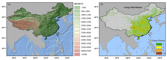 This study was conducted over mainland China, which is located in the east of Asia, west of the Pacific Ocean, ranging across 15°–58°N latitude and 72°–136°E longitude (Figure 1a). China is vast and has a complex topography, with flat plains in the east and plateaus in the west. The precipitation regime over China has obvious spatial variability, with a gradient from southeast to northwest. The climate of China is mainly affected by the monsoon system and topography, characterized by a warm and wet summer and a cold and dry winter.