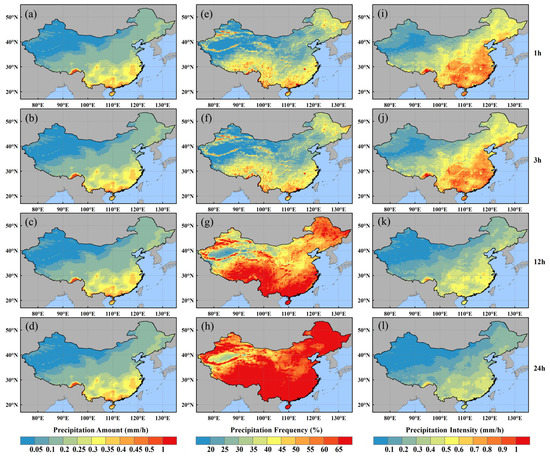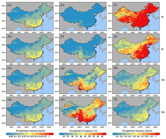 Spatial distributions of mean precipitation amount (a–d), precipitation frequency (e–h), and precipitation intensity (i–l) in summer from 2014 to 2019 over mainland China for MPA at four temporal scales.