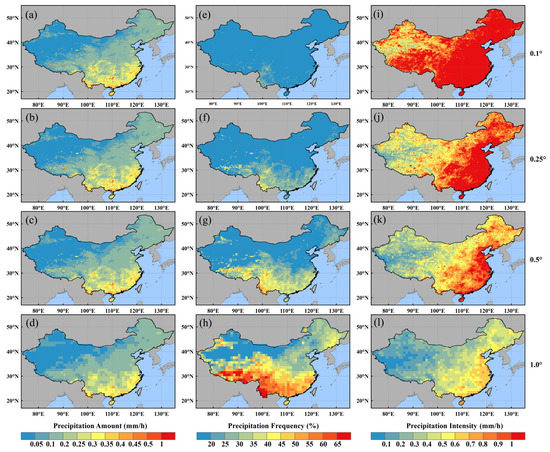 Spatial distributions of mean precipitation amount (a–d), precipitation frequency (e–h), and precipitation intensity (i–l) in summer from 2014 to 2019 over mainland China for MPA at four spatial scales.