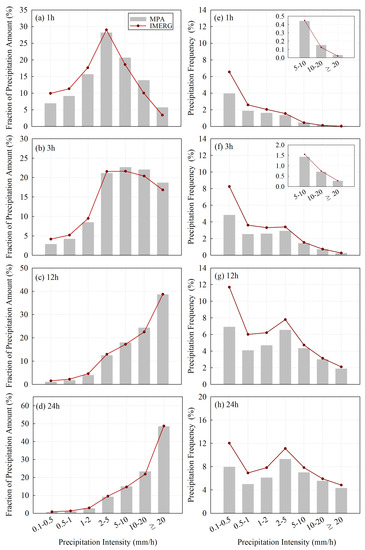 PA fractions (a–d) and PF (e–h) under different precipitation intensities at four temporal scales over mainland China, as derived from the IMERG and MPA products.