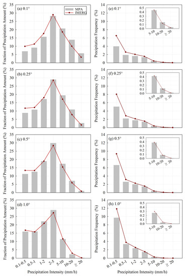 PA fractions (a–d) and PF (e–h) under different precipitation intensities at four spatial scales over mainland China, as derived from the IMERG and MPA products.