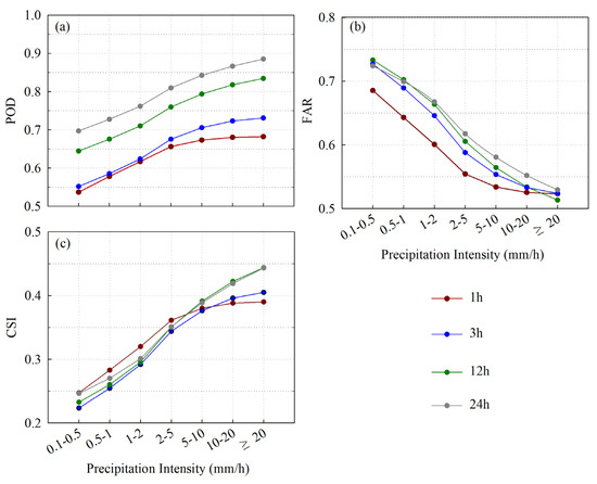 Three categorical metrics for IMERG under different precipitation intensities at four temporal scales over mainland China: POD (a), FAR (b), and CSI (c).