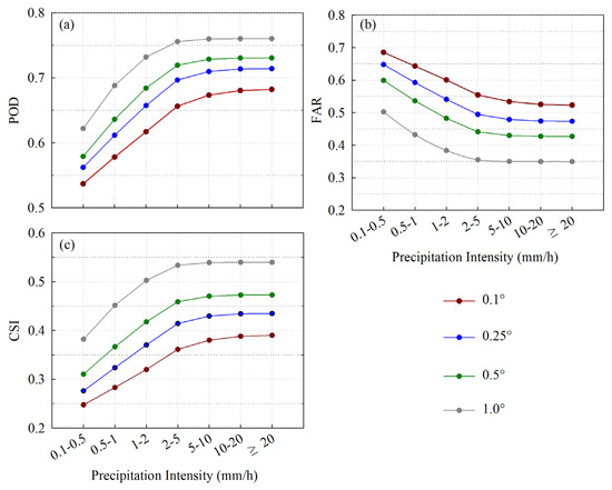 Three categorical metrics for IMERG under different precipitation intensities at four spatial scales over mainland China: POD (a), FAR (b), and CSI (c).