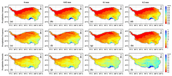 Spatial distribution of precipitation amount (PA) (a–d), frequency (PF) (e–h), and intensity (PI) (i–l) on the Tibetan Plateau under different thresholds at 0.1°/1 h scale.