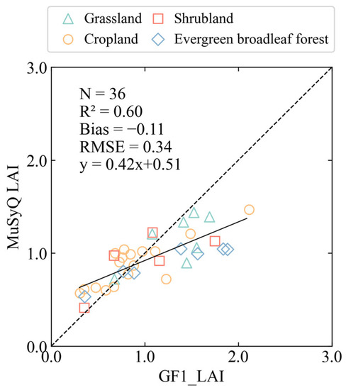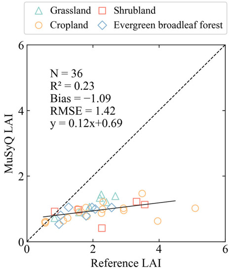 The validation results for each vegetation type were shown in Table 2. Shrublands and croplands were most underestimated in the MuSyQ LAI, which could be reflected in RMSE (1.66 for cropland and 1.68 for shrubland) and bias (−1.23 for cropland and −1.38 for shrubland). The RMSE for grassland and evergreen broadleaf forest was 0.90. However, a high consistency (R2 = 0.84) between MuSyQ LAI and reference LAI in grassland could be found in Table 2, indicating that the MuSyQ product could better represent grassland LAI in contrast to other vegetation types.