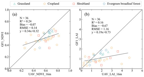 Data in the MuSyQ LAI product are the maximum LAI value over a 10-day window. The GF-1 surface reflectance data used in this paper are from the GF-1 WFV reflectance product and cover the same period as the MuSyQ LAI product. Reflectance data are not directly available from the UAV products; therefore, it is not possible to directly compare the reflectance from the two sensors. The 0.5 m resolution UAV NDVI image was upscaled to a resolution of 16 m to generate UAV_NDVI_16m. While GF1_NDVI was calculated by the GF-1 surface reflectance data. The UAV_LAI_16m and GF1_LAI were retrieved by the NDVI-LAI model for this study. The differences between UAV_LAI_16m and GF1_LAI reflect the influence of the reflectance data on the validation of the LAI products.