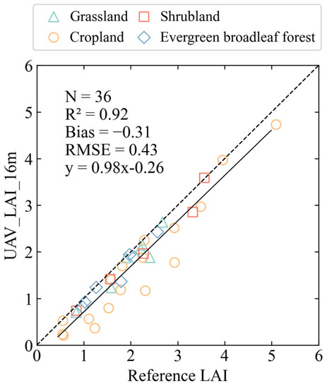 Tian et al. [40] found that the LAI obtained from coarse-resolution satellite data should match the average of the LAI values obtained from high-resolution satellite data when there were no scaling errors present. The scaling errors in the coarse-resolution LAI product are being investigated by comparing the differences between the reference LAI and UAV_LAI_16m. This comparison will help to partially quantify the errors in the LAI product validation process. A comparison between the LAI values obtained from two distinct up-scaling methods is illustrated in Figure 9. The mean LAI value for UAV_LAI_16m and the reference LAI are 1.72 and 2.03, respectively, indicating a difference of 0.31. The underestimation of the UAV_LAI_16m by approximately 15.27% in comparison to the reference LAI accounts for 28.44% of the total bias, demonstrating that scale effects play a significant role in the uncertainty associated with the MuSyQ LAI products.