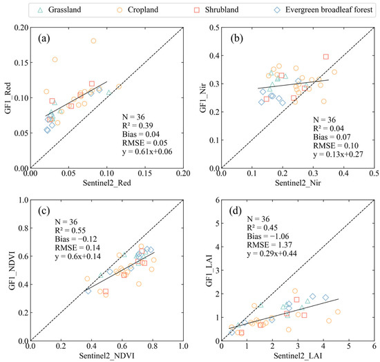 The agreement between the Sentinel-2 surface reflectance and the GF-1 surface reflectance is poor for both the red and near-infrared bands (Figure 10a,b). Although GF-1 shows some overestimation at the red and near-infrared reflectance, good agreement between the NDVI values from GF-1 and Sentinel-2 can be seen. Sentinel-2 NDVI is generally higher than GF-1 NDVI, leading the vegetation information to be captured better (Figure 10c). The comparison presented in Figure 10d reveals that, in general, Sentinel-2 LAI values are higher than GF-1 LAI values. This disparity suggests that the LAI values in the MuSyQ products may be underestimated compared to the UAV images, possibly due to discrepancies in the reflectance data utilized.