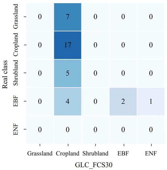 Uncertainties in LAI products are mainly caused by the input parameters (e.g., surface reflectance and land cover classification) and the retrieval algorithm [44]. The impact of surface reflectance and retrieval model on LAI product has been investigated in this work. Note that the error of land cover classification may also introduce uncertainty into LAI retrieval. In this study, the land cover classification data is obtained from the global land-cover product generated by Zhang et al. [45], which has a spatial resolution of 30 m and is retrieved using Landsat time-series imagery (GLC_FCS30). As shown in Figure 11, a confusion matrix is used to estimate the accuracy of GLC_FCS30 land cover classification with the use of 36 real samples. Sixteen pixels are misclassified as cropland, including grassland (7), shrubland (5), and broadleaf evergreen forest (4). The effect of misclassification on shrubland and broadleaf evergreen forest may cause a slight underestimation of LAI in the MuSyQ products.
