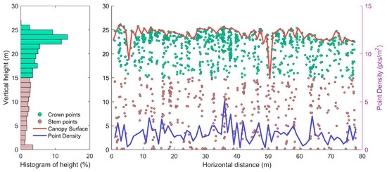 A profile of airborne LiDAR data representing a transect of the northern red oak stand in the study site. The red curve stands for the canopy height model (canopy surface), and the blue curve stands for the LiDAR point density distribution.