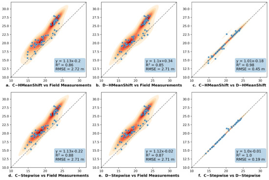 Correlations with heatmap in estimations of tree height between the field measurements and the designed approaches. Dash lines are x = y; the blue box includes regression line expression, R-squared, and RMSE.