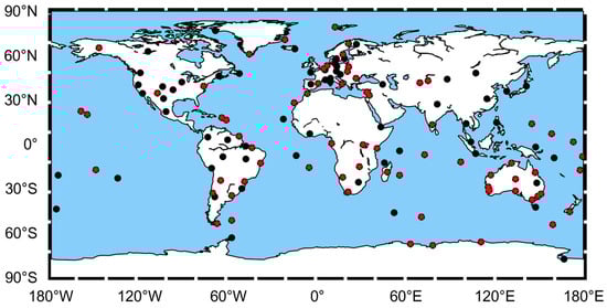 In this contribution, a maximum of 130 globally distributed IGS (International GNSS Service [26]) stations (see Figure 1)) during 2019–2021 are selected for the GCC estimation. To make better alignments of solutions to ITRF, we imposed minimum constraints, including No-Net-Translation (NNT) and No-Net-Rotation (NNR), on the core network of IGS (represented by red stars in Figure 1).