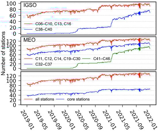 Figure 2 shows the availability of ground stations with IGSO and MEO satellites tracking capability from 2019 to 2021. With the deployment of Trimble Alloy and the update of Trimble NetR9 over the three years, the number of stations tracking BDS satellites has gradually increased from around 80 to 130. Meanwhile, although several new BDS-3 satellites (i.e., C38–C46) were launched in late 2019 and early 2020, they could only be tracked by a few stations before 2021. After the firmware updates of Septentrio receivers, the number of stations tracking these newly deployed BDS-3 satellites saw a sharp increment around the beginning of 2021 and kept growing for the rest of the period shown.