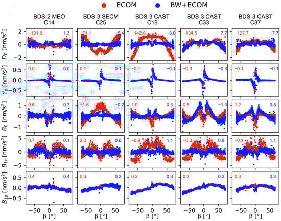 To further explore the advantages of the box-wing model for GCC estimation, we compared the ECOM estimates before and after the inclusion of the box-wing model. Figure 4 shows ECOM estimates of representative satellites from five different groups shown in Table 3, that is, C14 for BDS-2 MEO, C25 for BDS-3 SECM (Shanghai Engineering Center for Microsatellites), C19, C33, and C37 for BDS-3 CAST (China Academy of Space Technology) with different patterns. The results are shifted by the mean values of estimates for better comparison. In general, the addition of the box-wing model dramatically decreases the magnitude of the and flattens the visible pattern of and . However, the Y estimates during eclipse seasons are not effectively managed, indicating that it is controlled by other unconsidered physical effects, e.g., solar sensor bias, satellite body radiator emission, and solar panel thermal radiation. Nonetheless, the a priori box-wing model compensates, to some extent, for the radiation-related disturbances, which is beneficial in recovering the GCC.