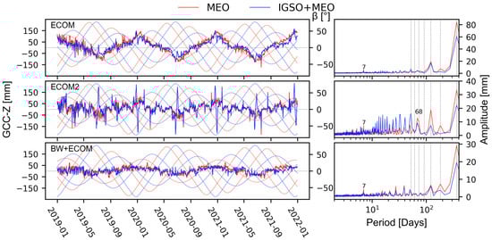 Figure 3 shows the time series and spectra of GCC-Z derived from BDS MEO satellites for ECOM, ECOM2, and BW + ECOM solutions. When ECOM is adopted, the peak-to-peak excursion of GCC-Z reaches about 30 cm and has a period of about one year. This periodic excursion seems to be related to the draconitic year (the revisit cycle of the satellite with regard to the sun), and it is reflected as a dominant annual signal with an amplitude of 84.6 mm in the GCC-Z series. Meanwhile, a significant 3 cpy (cycle per year) signal in the GCC-Z series reaches the amplitude of 19.6 mm, which is mainly related to the maximum angles of the three MEO orbital planes, and therefore has a period of about one-third of a year.