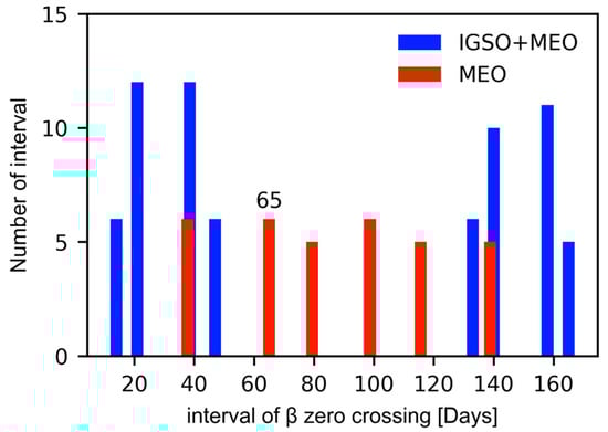 However, in the case of ECOM2, when the angle of the IGSO orbital plane is close to zero, a noticeable peak occurs in the GCC-Z series. It is mainly attributed to the poor performance of ECOM2 during the eclipse season. Figure 6 shows the histogram of intervals between consecutive orbital planes of BDS along the ecliptic. It is clear that the visible 68-day signal in the MEO-derived ECOM2 solution (see Figure 5) is related to the 65-day interval of zero crossing for MEO. After the inclusion of IGSO satellites, the intervals move to the range of approximately 10–50 days, which gives rise to these artificial signals at corresponding periods.