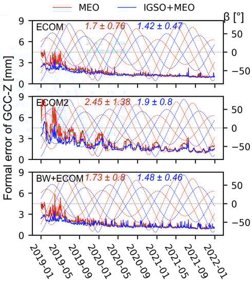 Time series of formal error of the GCC-Z in mm. The curves denote the sun elevation angles above orbital planes, which are distinguished by two different colors (red for MEO and blue for IGSO).