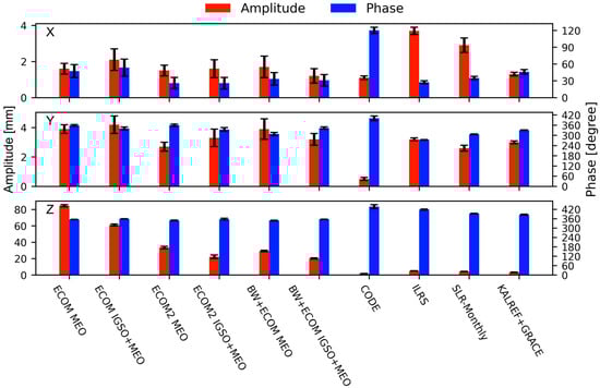 Figure 8 and Table 6 show the amplitudes and phases of annual signals of all solutions in this paper. For a better comparison, a phase shift of 2π has been applied to the phases of the annual signals in GCC-Y/Z for CODE solution, as well as GCC-Z for ILRS, SLR-monthly, and KALREF+GRACE solutions. We found that for these BDS-derived solutions, the difference in SRP modeling and inclusion of IGSO satellites have little impact on the annual signals of the X and Y components of GCC. Compared to the ILRS solution, however, there is an approximate 2 mm amplitude offset in the GCC-X series and an approximate 60 degree phase shift in the GCC-Y series. It may be caused by the different distribution of the ground stations of GNSS and SLR, which has been discussed by Zajdel et al. [19]. For the GCC-Z series, the different solutions show significant differences in annual amplitude and phase. The results of the BW + ECOM model have smaller annual amplitudes than the purely empirical SRP models and are more consistent with the CODE and ILRS solutions.