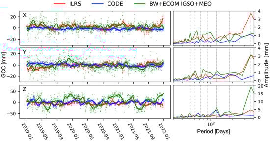 Finally, we identified the IGSO + MEO based BW + ECOM solution as the most reliable among all the other solutions. To visualize the achieved results, Figure 9 presents the three geocenter components derived from the IGSO + MEO constellation of BDS using the BW + ECOM model. The bold lines represent the filtered series using the Vondrák filter [42] with a smooth factor of 0.01. It shows that the equatorial X and Y components of GCC are close to the SLR results, which is consistent with the conclusion of others using observations of GPS or GLONASS [11,12,14]. For the Z component, the majority of the spurious signals are largely mitigated. However, a dominant annual signal with an amplitude of 20.2 mm still remains for the BW + ECOM solution. In addition, a distinct 3 cpy signal with the amplitude of 6.1 mm is found in the BW + ECOM solution, which can also be visible for the CODE solution due to the 3-plane constellation characteristics of GLONASS and Galileo.