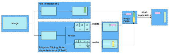 Figure 2. The overall process can be simplified as follows: two strategies, full inference (FI) and ASAHI, are applied to the original images simultaneously. In FI, the full images are sent to the inference stage. By contrast, ASAHI adaptively changes the slicing size to control the number of slices according to the image resolution. In the inference stage, the full image and sliced image are processed by TPH-YOLOV5 [