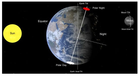 Recently, studies have reported that nightlight remote sensing provides a reliable tool for acquiring land surface data under low-light conditions at night [46,47,48], and it has been confirmed that moonlight can be a stable light source for the detection of non-luminous objects at night, especially snow/ice cover and forests, using nightlight remote sensing data [47]. Additionally, snow/ice cover detection from polar and mid-latitude mountains in short cycles is also obtained under moonlight illumination [49]. It is known that the Earth is one of the planets of the solar system and revolves around the Sun every 365.26 days, with an axial tilt of about 23.5 degrees. It is this “angle offset” that leads to the polar summer(day)/winter(night) period in the North and South Poles of the Earth, a phenomenon where the center of the Sun is below a free horizon in the polar circles. On the other hand, the Moon, as the only natural satellite of the Earth, travels once around the Earth every 29.5 days. Due to the moon’s unique materials and special space locations, moonlight is the periodic source of light to the Earth at night. The Moon glows as its surface reflects light from the Sun. Thereby, moonlight can periodically illuminate the polar regions during the polar winter period, as shown in Figure 1. The perceived brightness of the Moon from Earth is dependent on its orbit around the Earth, its terrain, and Sun/Moon (S/M) and Earth/Moon (E/M) distances [46], and the differences in brightness between the entire moon phases are, thus, relatively complex, causing multi-temporal moonlight remote sensing data to be difficult to process.